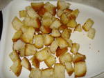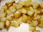 We had some old french rolls that were on their way to being hockey pucks, so instead of throwing them out, I decided to cube them up and throw them into a hot pan with a some olive oil, salt, pepper, and a dash of garlic salt.