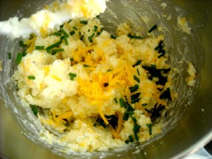 4. Add in the salt and pepper, cayenne, cheese and chives. Mix again on low until well combined.
