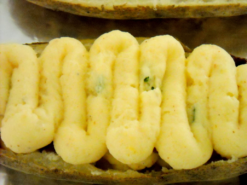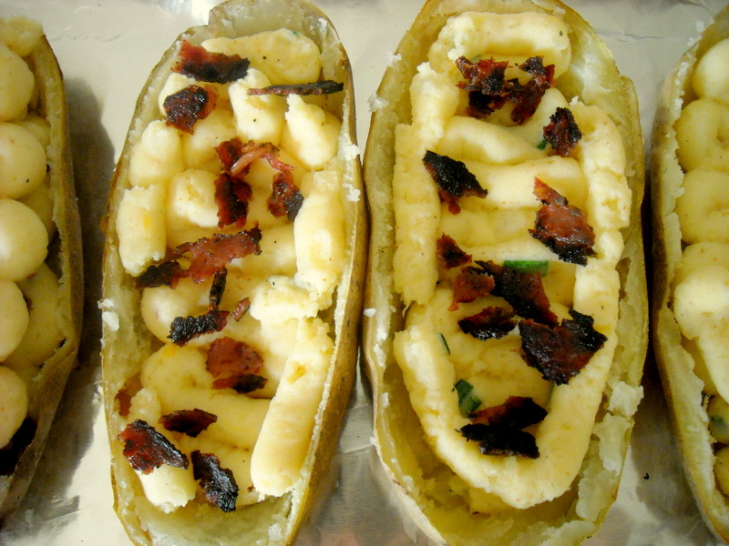 5. Scoop back onto the potato skins, or scoop into a plastic bag and cut off a bottom corner and squeeze into the skins. (Of course, for all you fancy and experienced chefs out there, you’ll use a pastry bag. hmph.)