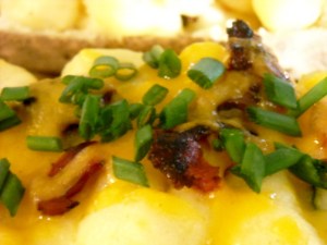 7. Once out of the oven, top with snipped chives and sprinkle with bacon (if using)