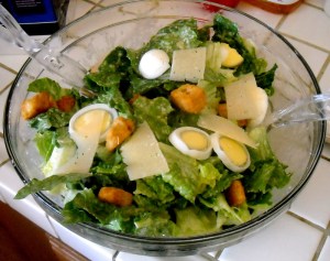 This past week I scheduled Grilled Chicken Caesar Salad for dinner (and grilled some extra chicken for the next night for chicken loaded nachos.) I marinated the boneless skinless chicken breasts in the same marinade I made for some grilled salmon way back yonder. Then sliced it and loaded it up on top of freshly torn romaine leaves with sliced hard-boiled eggs and Texas toast croutons. The only problem? We had no Caesar dressing.