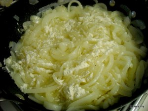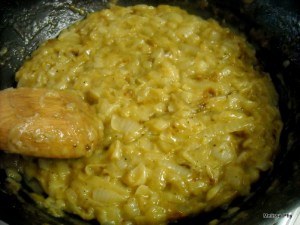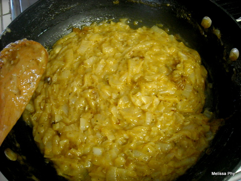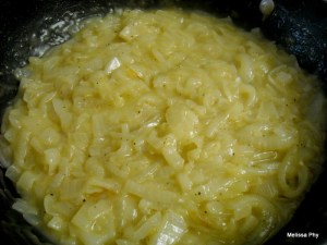 - Continue this process for about 45 minutes to an hour. You want your onions to be brown (not too, dark, but not light. You’ll know by instinct when they’re ready) *NOTE:The flour is going to help make it like a paste. They may look nasty in the pan, but they’ll separate when you add them to the broth.