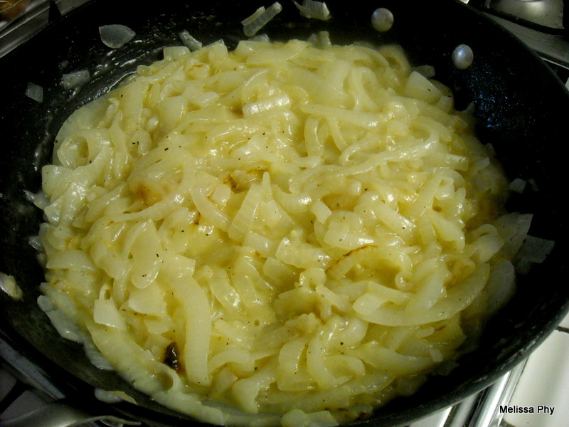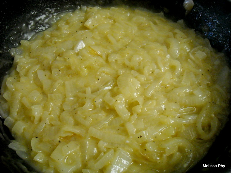 - Throw the sliced onions and butter in a large pan over medium heat, stirring to coat all onions in butter.