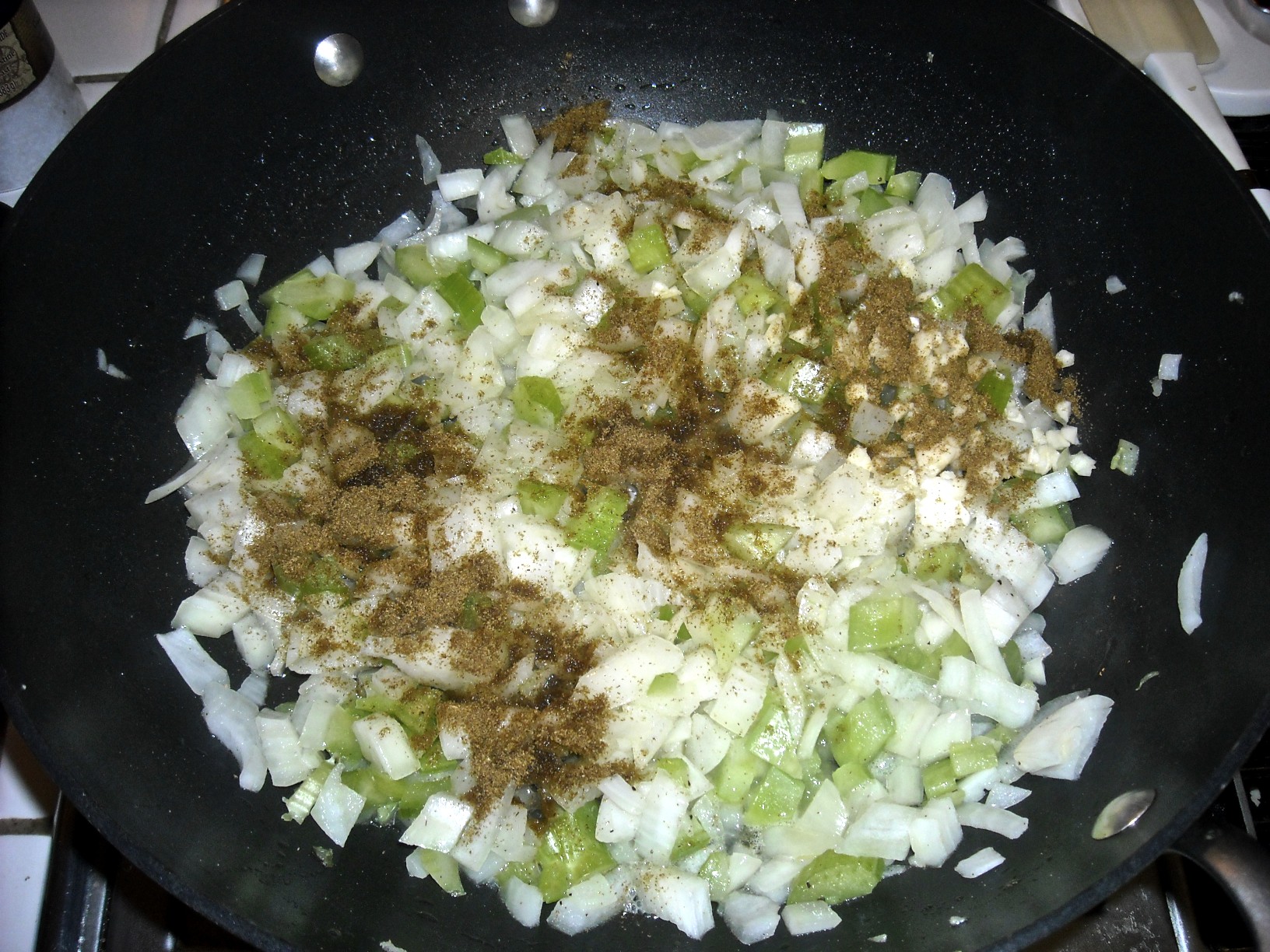 - Sprinkle on the cumin and add the garlic and cook for another minute.