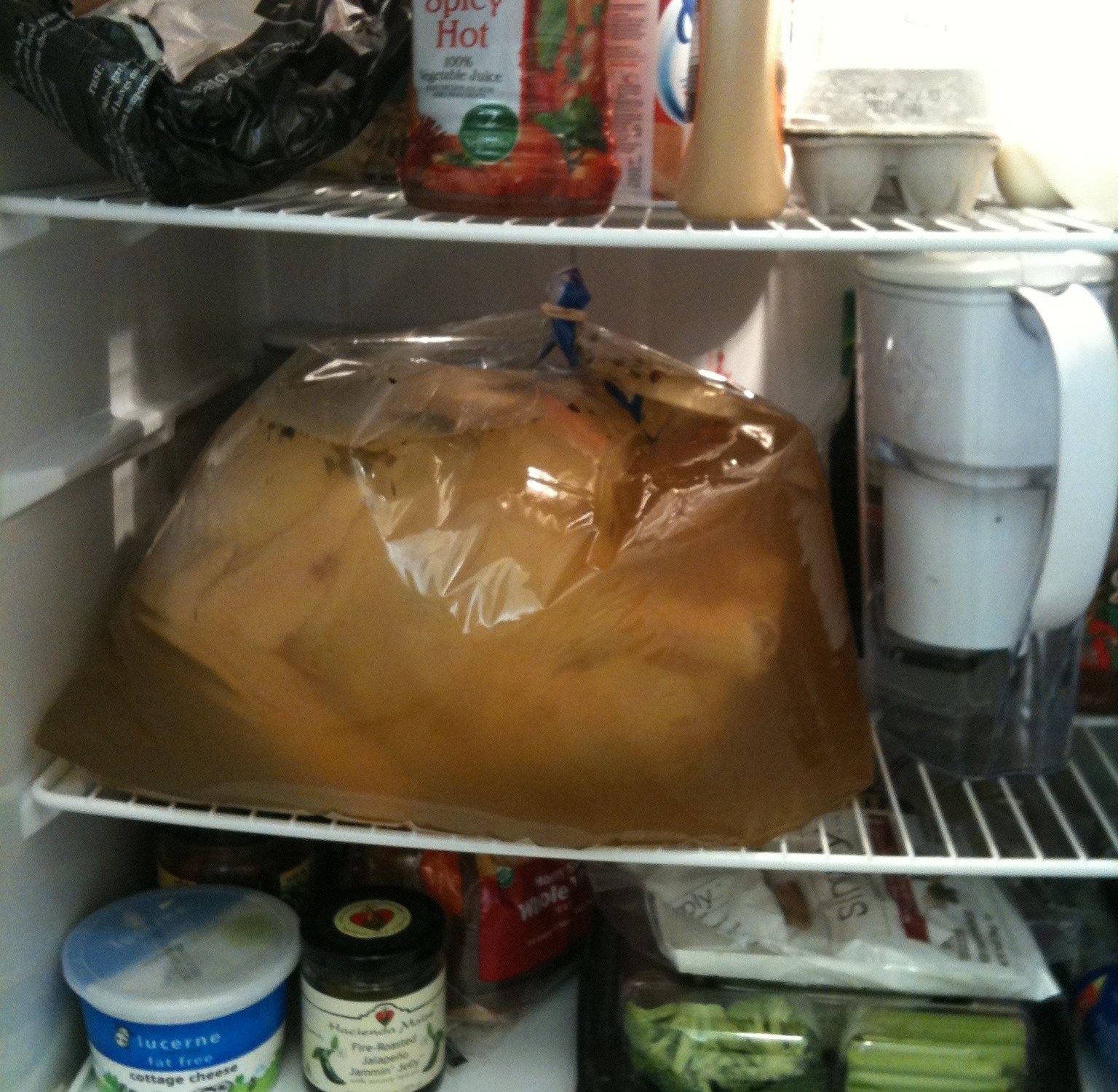 Once I was satisfied with my clean up efforts, I moved on to the more daunting task of moving the turkey back into the fridge. Now, not only do I have to move a 12lb turkey, I also have to move 5 or 6 gallons of liquid with it…in a bag that’s already done me wrong.