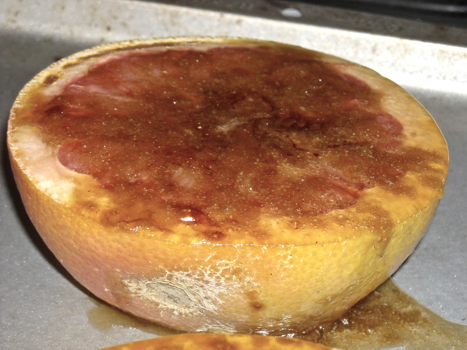 A nice farmer at the Coronado Farmers Market (you can read about his fruit here) gave me some free citrus this week—grapefruits and these lemon/lime/orange things (more on those later.) Well, thanks to Pinterest, I remembered seeing a picture of a broiled grapefruit. I was sold instantly.