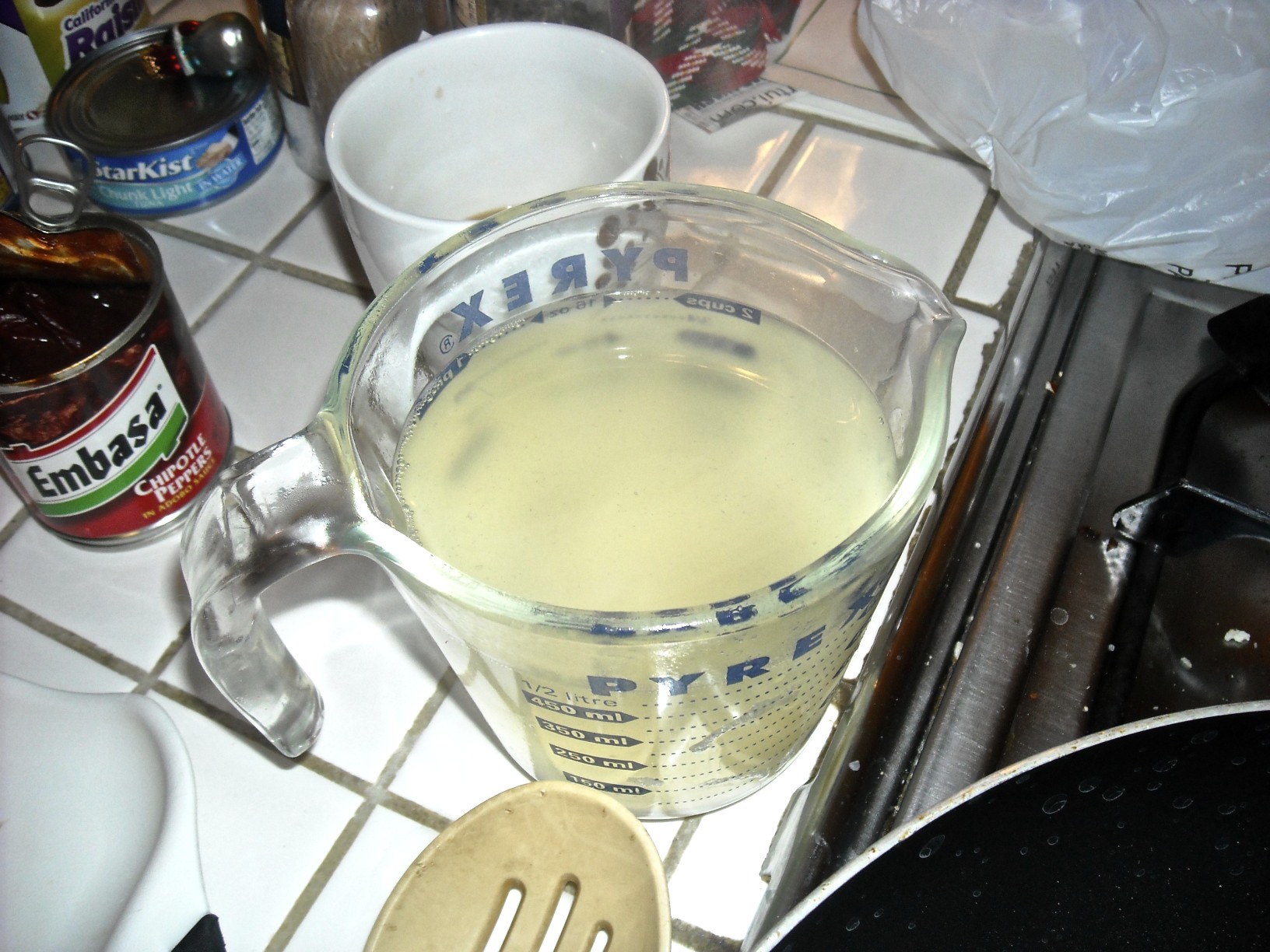 Then, when your pasta is cooked to your liking, take a glass liquid measuring cup and scoop out about one or two cups of the boiled pasta water.