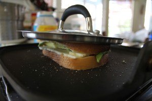 - Cook over medium heat on a skillet, smooshing the sandwich down with a griddle pan or a lid.