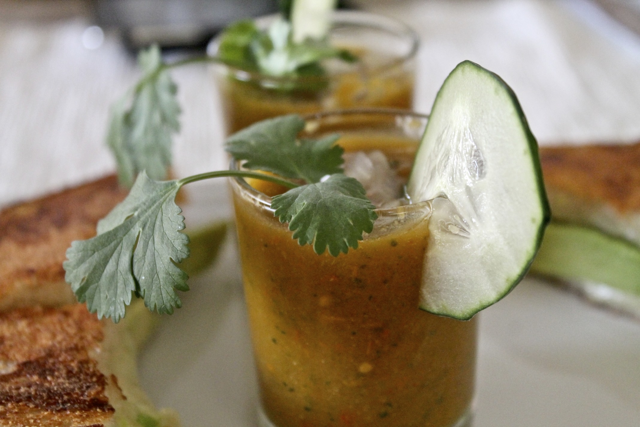 - Pour into shot glasses and enjoy aside a hot grilled cheese (see below). Garnish with cucumber, cilantro and shallots.