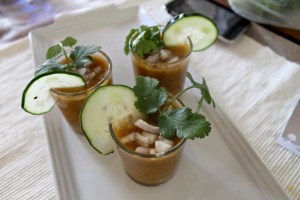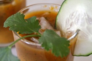 Gazpacho is basically a cold soup made with raw vegetables, no cooking involved. It’s especially delicious when the weather’s warm and here in SoCal, the weather’s been pretty beautiful. Of course, as I type this today it’s cold, wet and rainy.