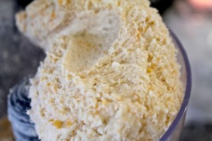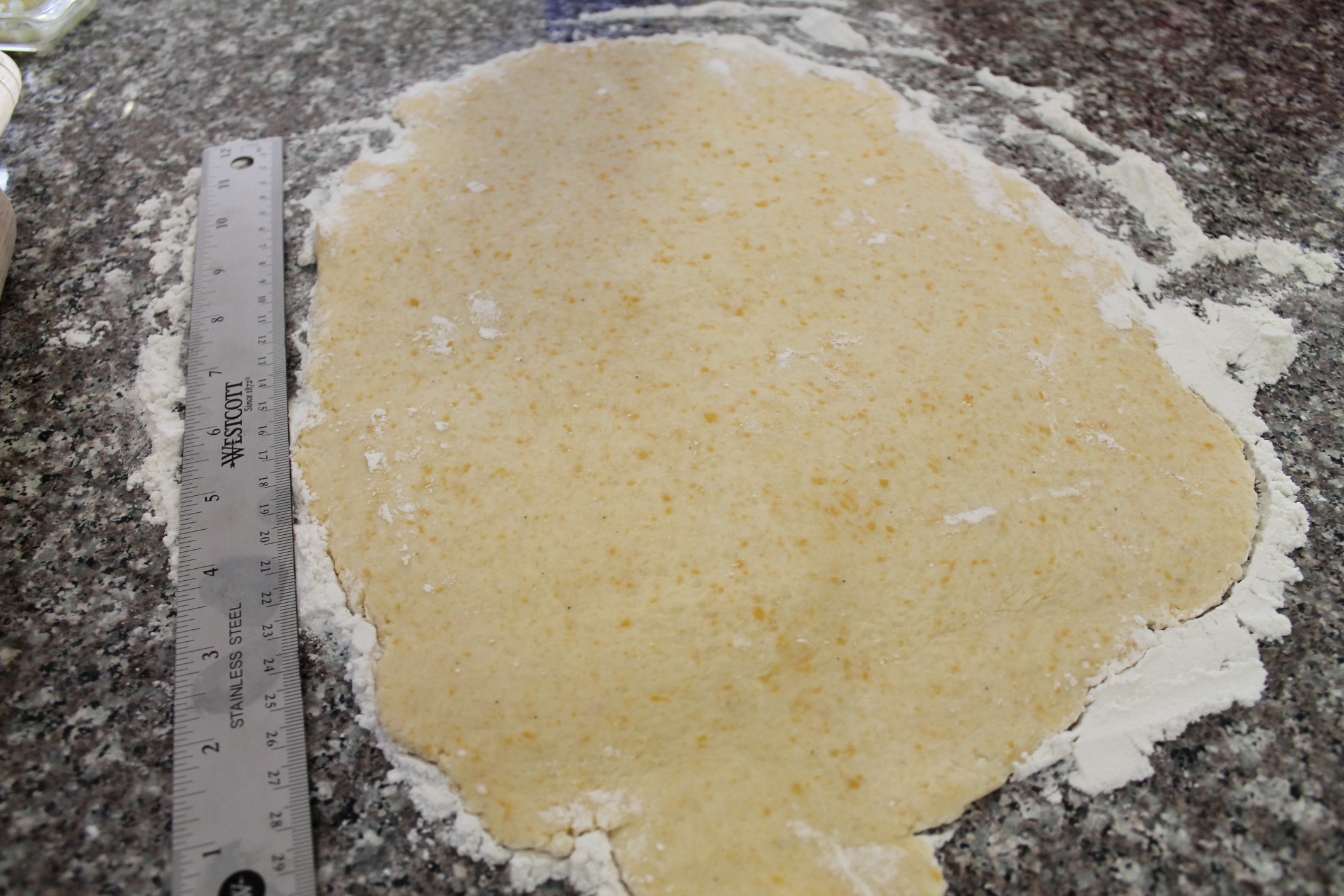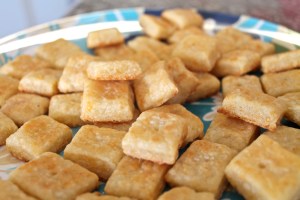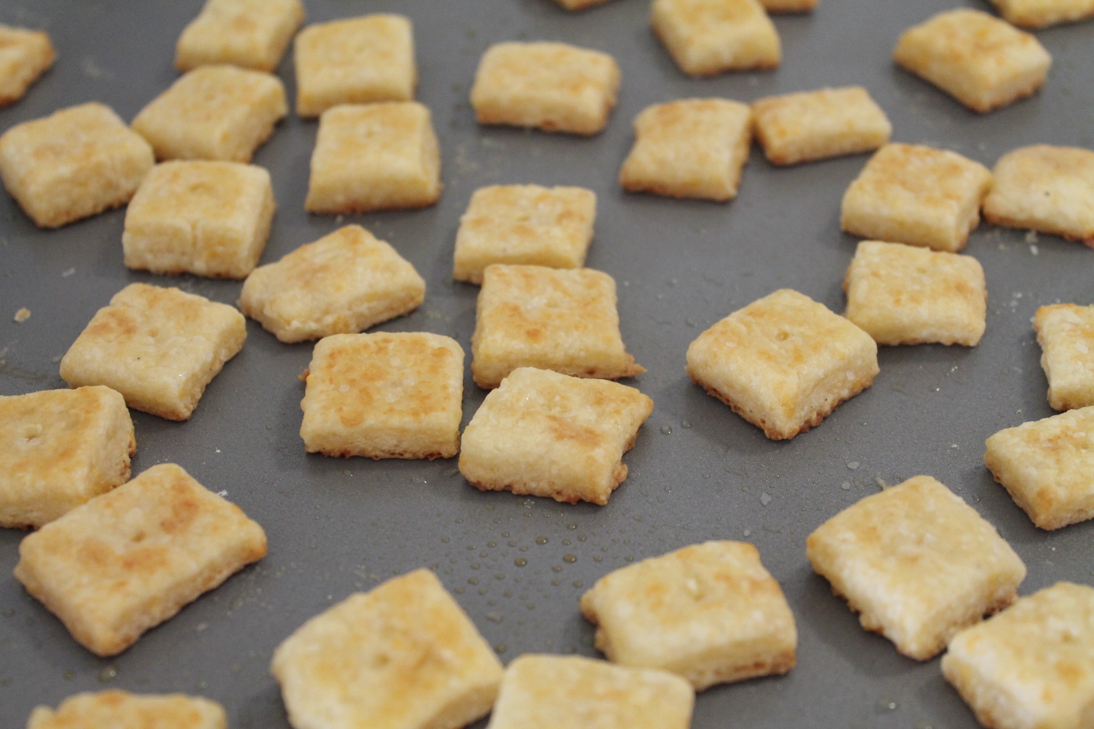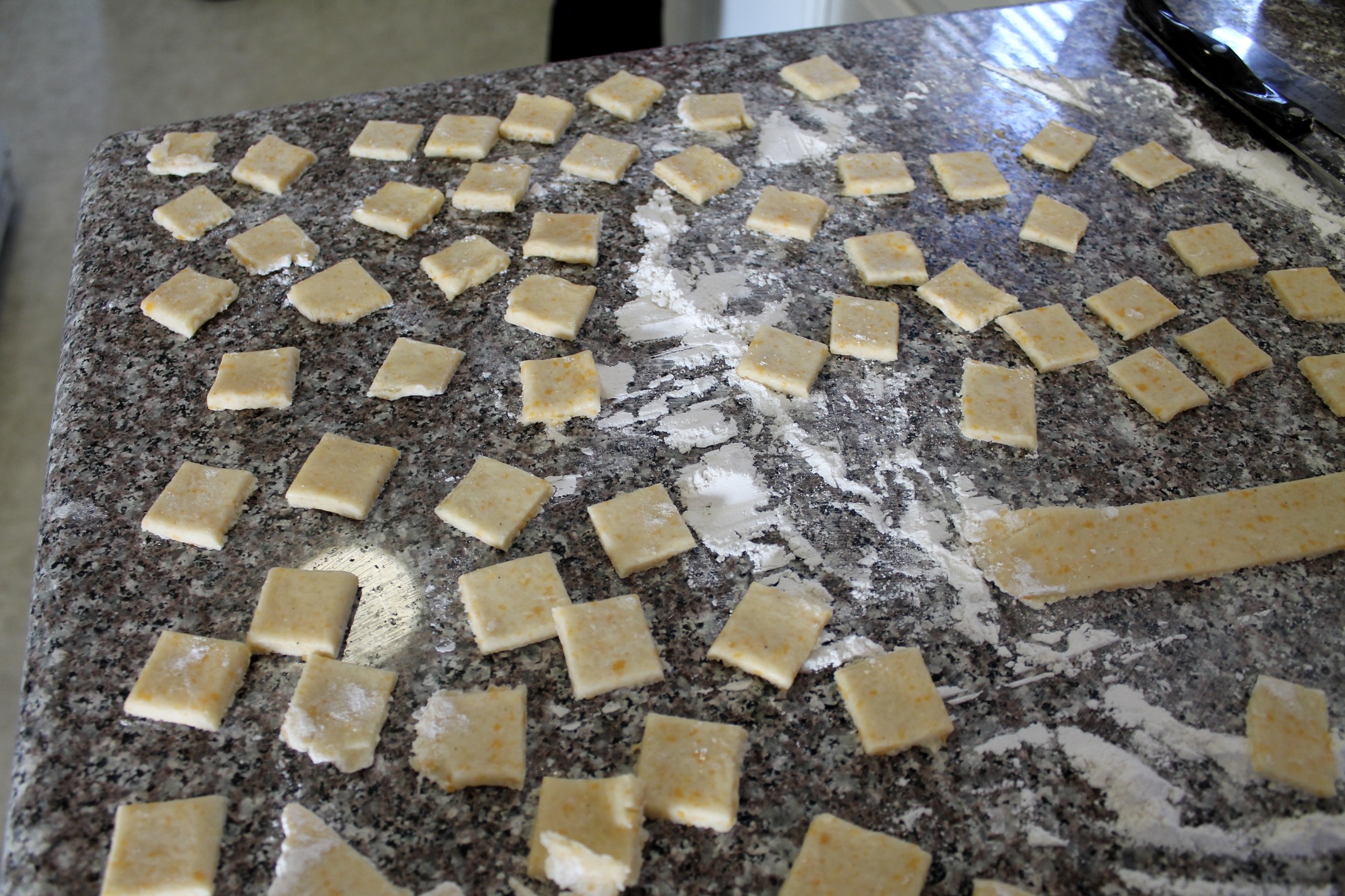 After you combine all your ingredients, which are really just cheese, flour, butter and milk, you roll out the dough and cut some 1×1 inch squares.