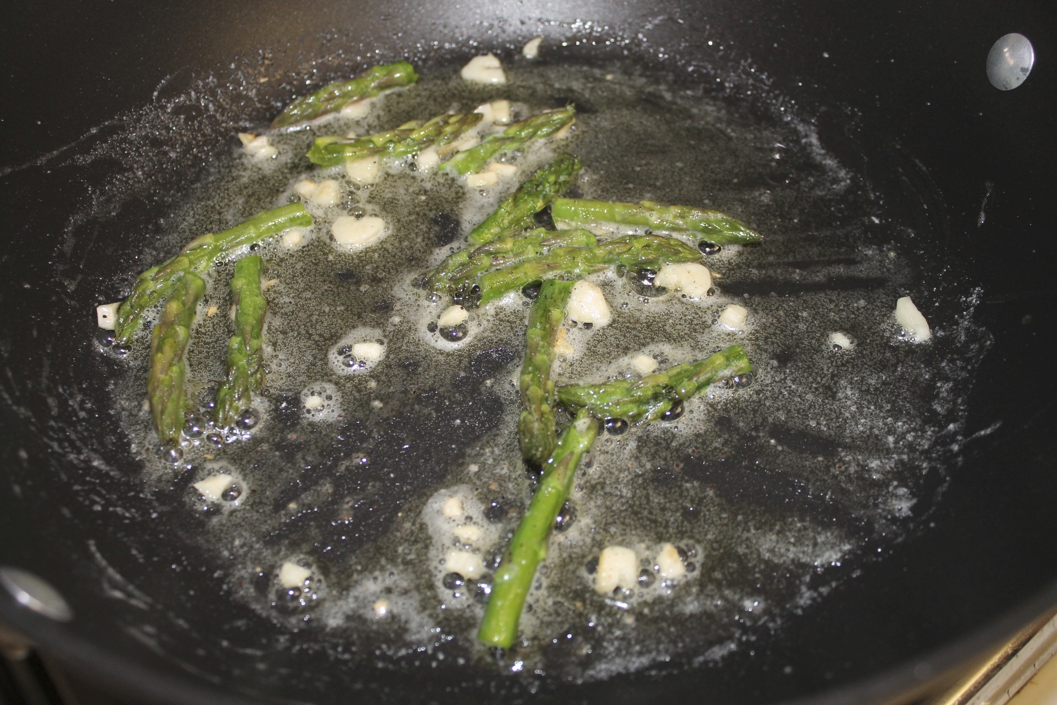 - Add the asparagus and cook for another three minutes, stirring often. Season with salt and pepper.