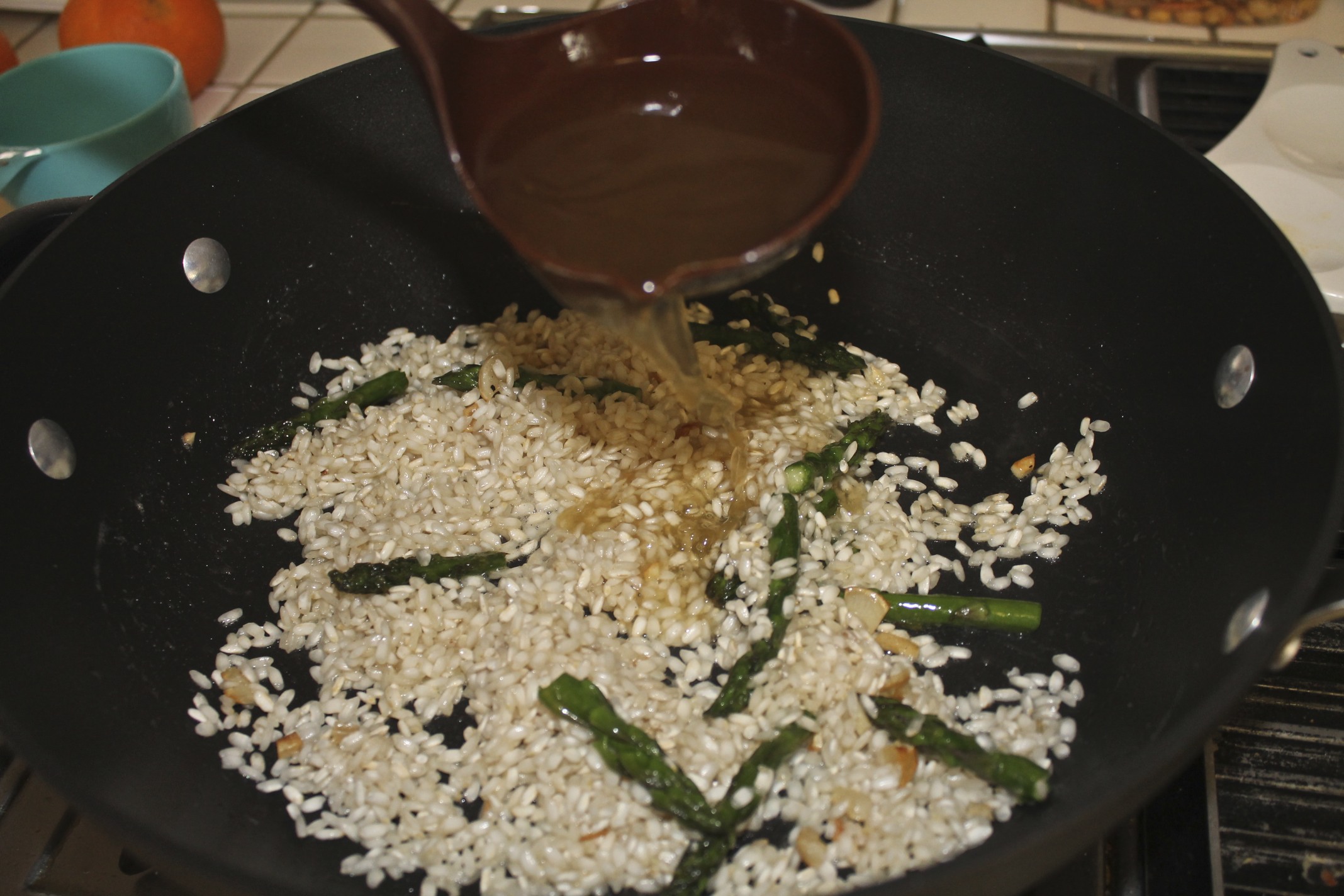 - The trick to knowing when to add more broth is simple: The rice will be dry enough that your stirring spoon leaves a trail showing the bottom of the pan.