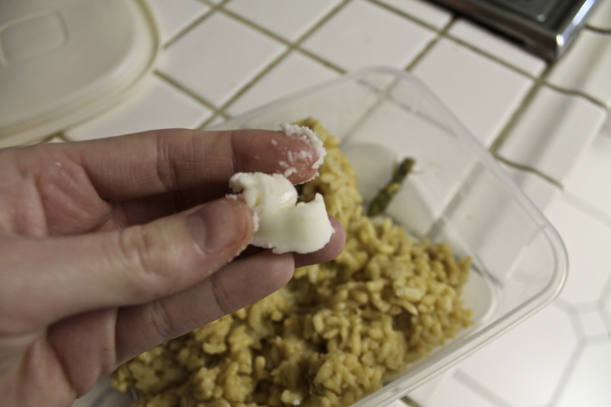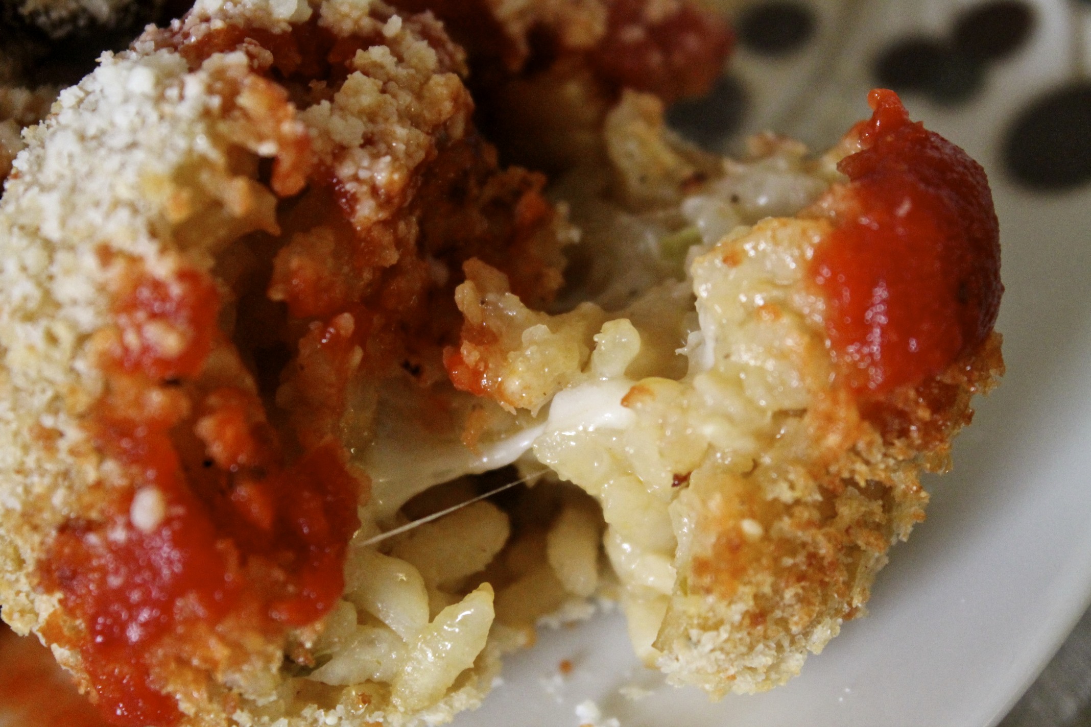 I just folded some fresh mozzarella into the balls I formed with the days-old risotto. A lot of recipes will tell you to add an egg or two to your leftovers to help with binding. But mine held up just fine sans egg.