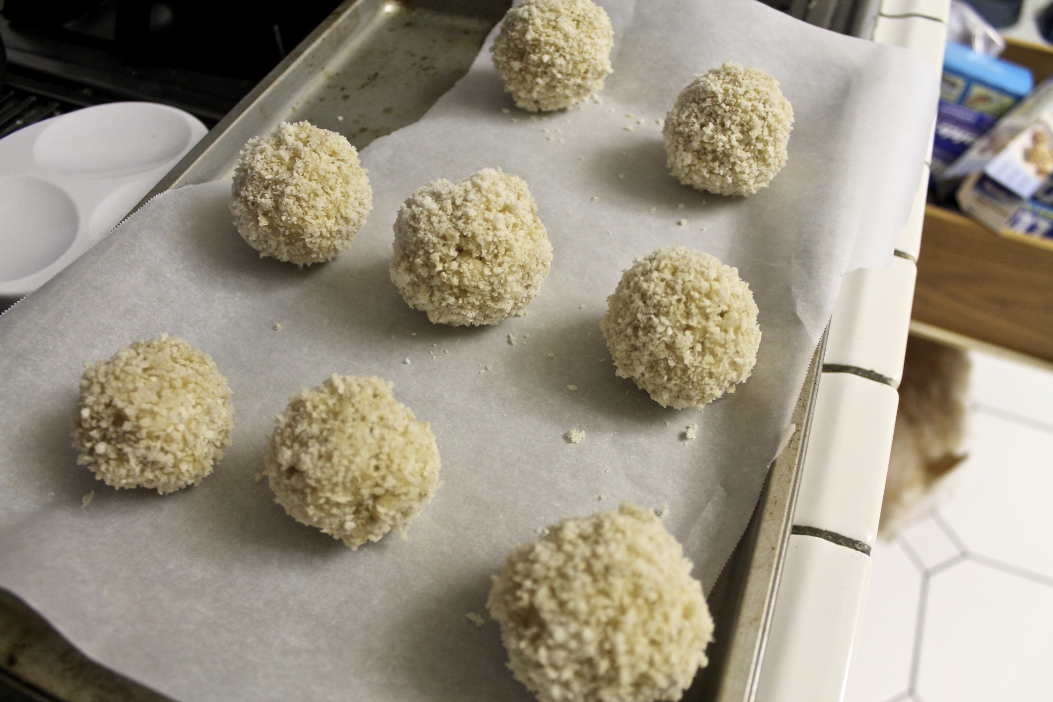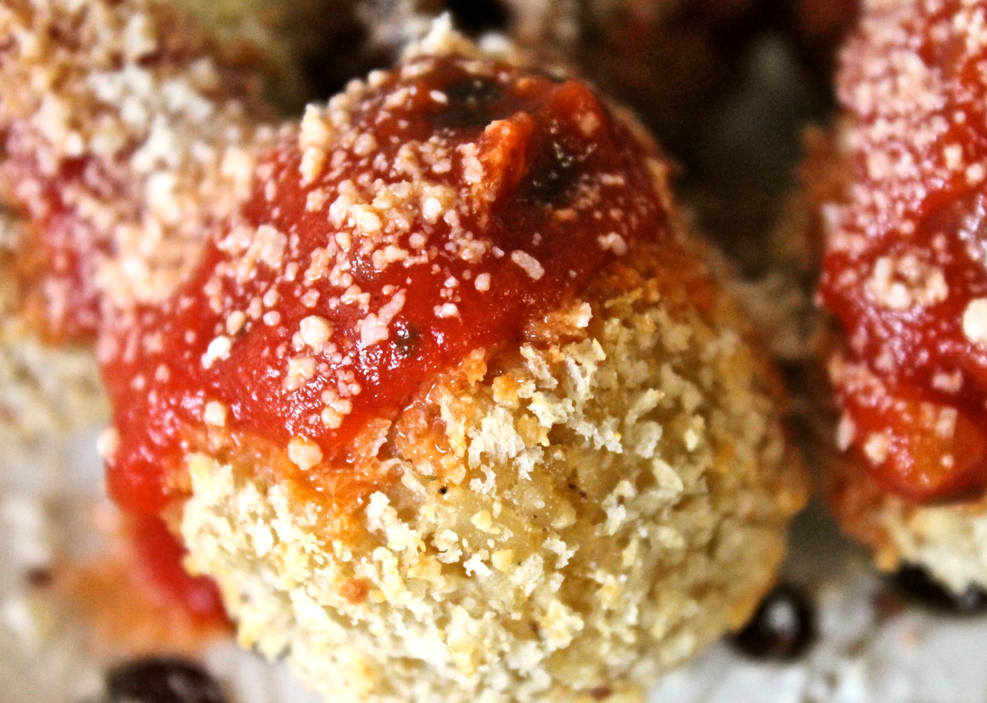 Then I rolled them in a mixture of panko and parmesan/romano cheese and baked them for about 30 minutes. I gave them a quick shower of PAM cooking spray before sending them in to the 425 degree oven, though, to help with browning.