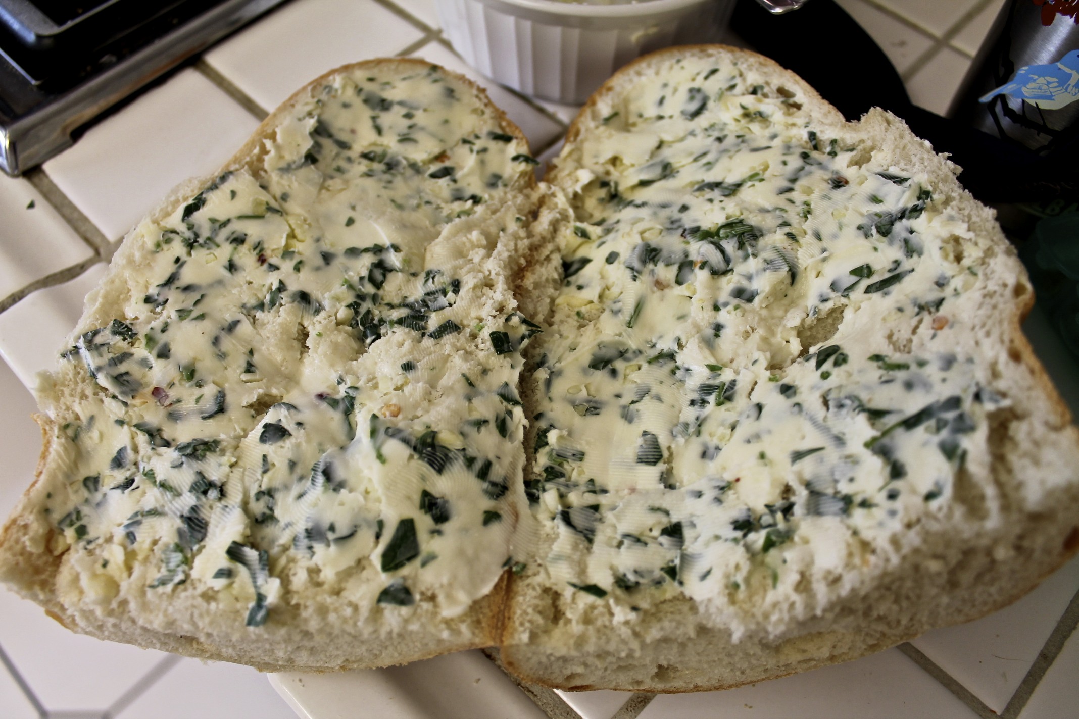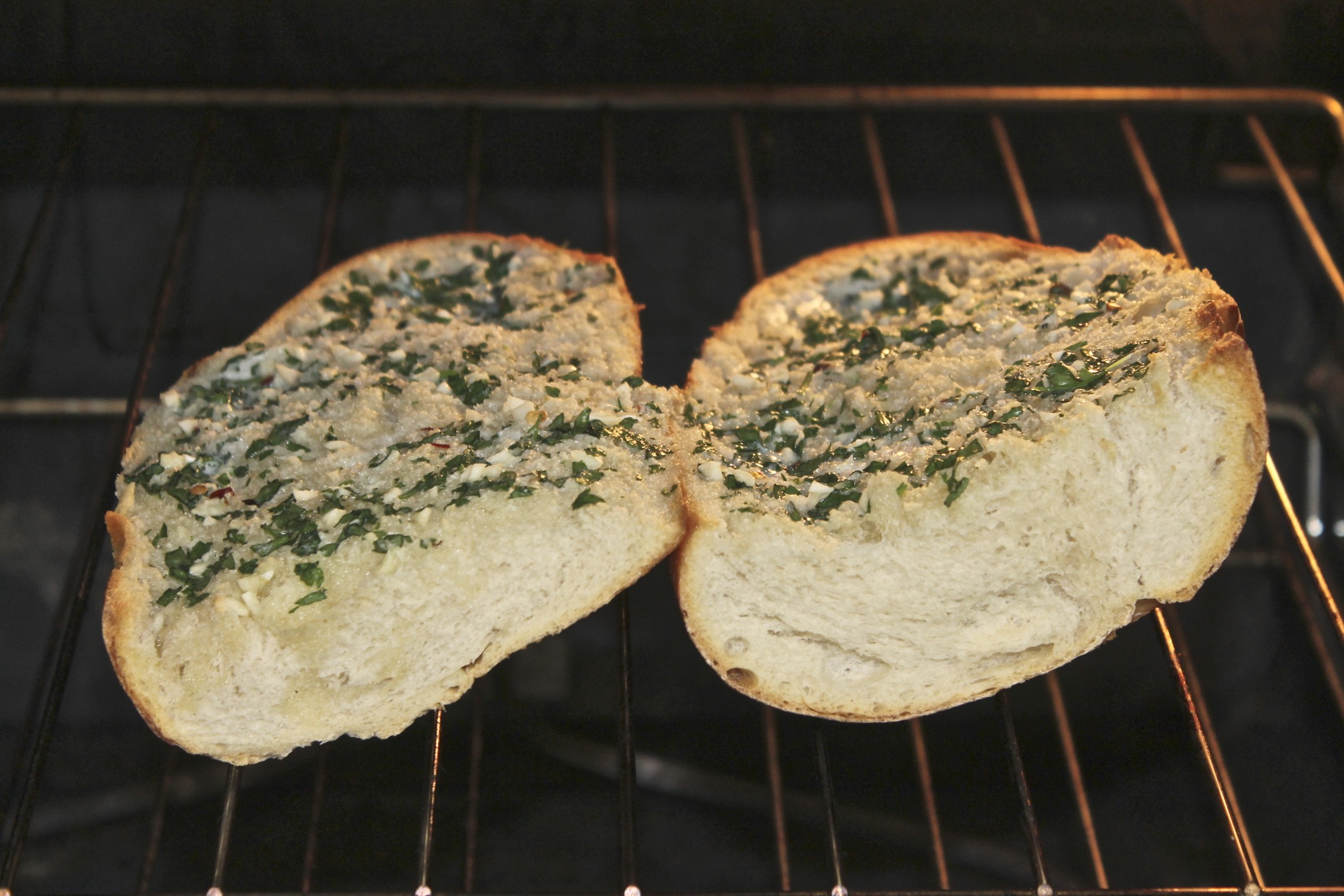 3. Spread the butter on half a loaf of bread, that’s been sliced length-wise. Bake it at 400 degrees CLOSED for about 10 minutes or so.