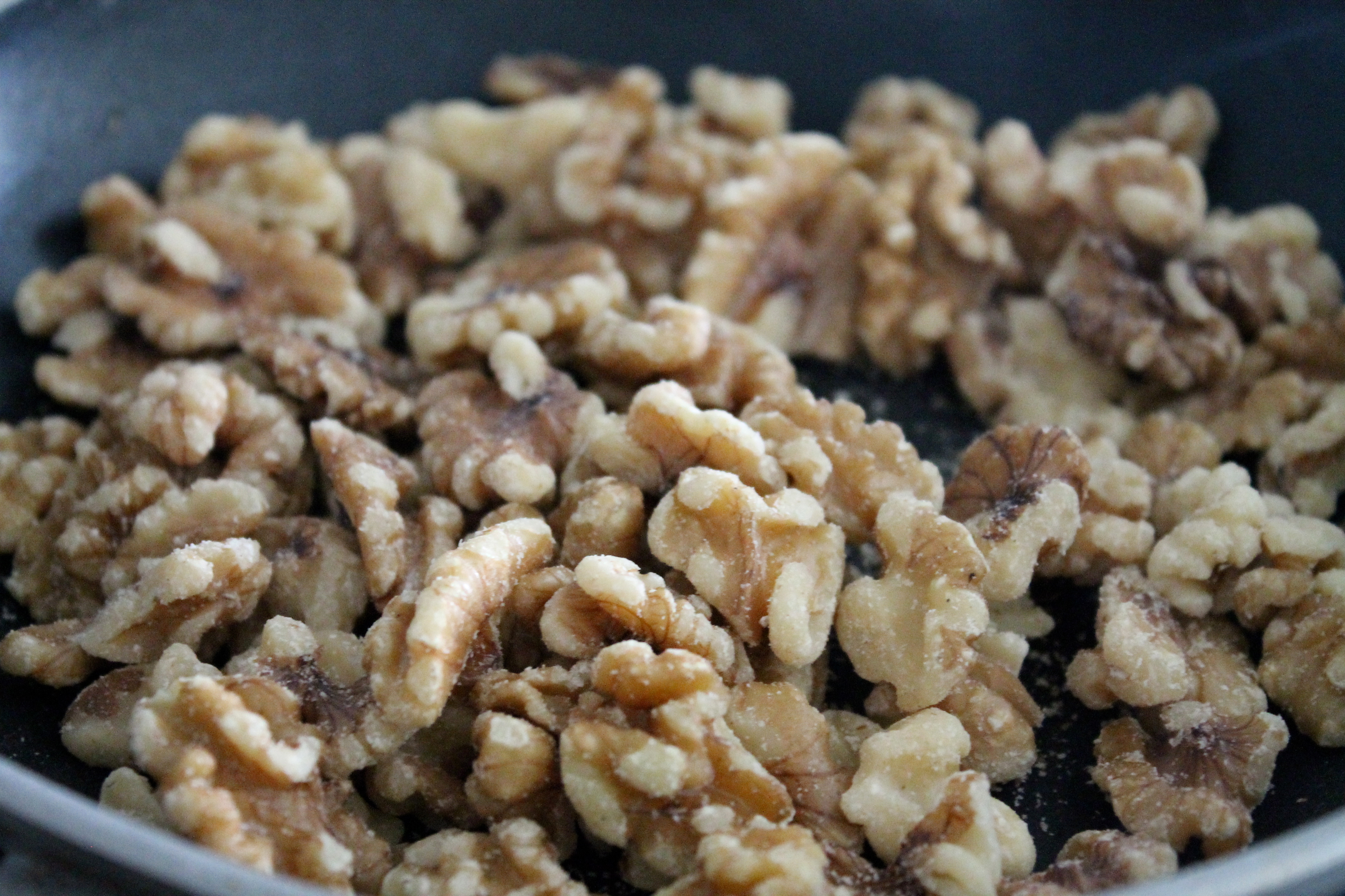 Pine nuts are delicious (I used them in Monday’s meatless recipe), but they’re also expensive. And the little voice in my head said “reach for the walnuts.” So I did.