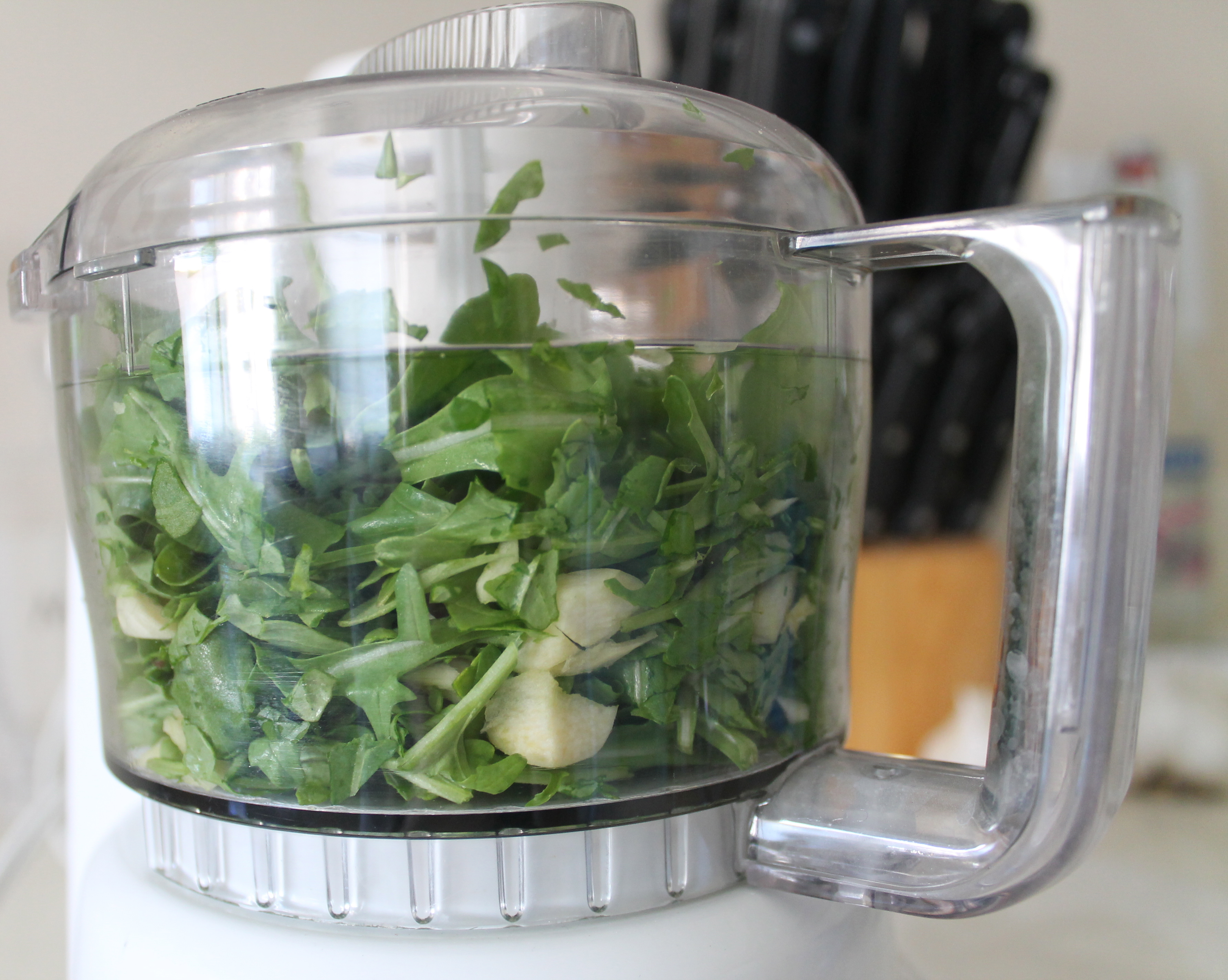 - In a mini chop or food processor, combine garlic, walnuts and arugula. Chop until well combined.