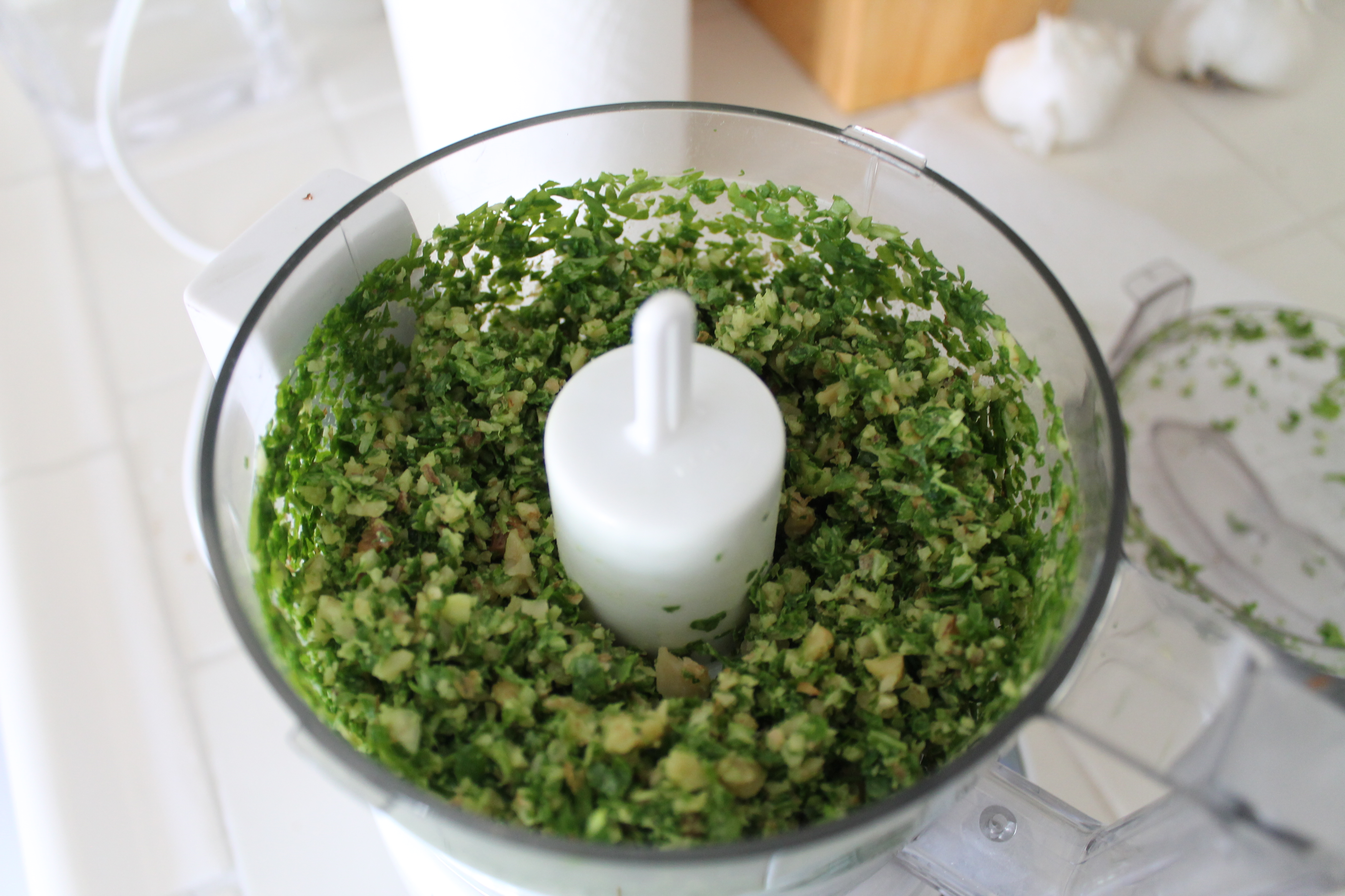 - Add salt and pepper and then slowly add EVOO while mixing until desired consistency. If you’re using a mini chopper, you won’t be able to stream in the EVOO. Just add a tablespoon or two at a time and then chop until desired consistency.