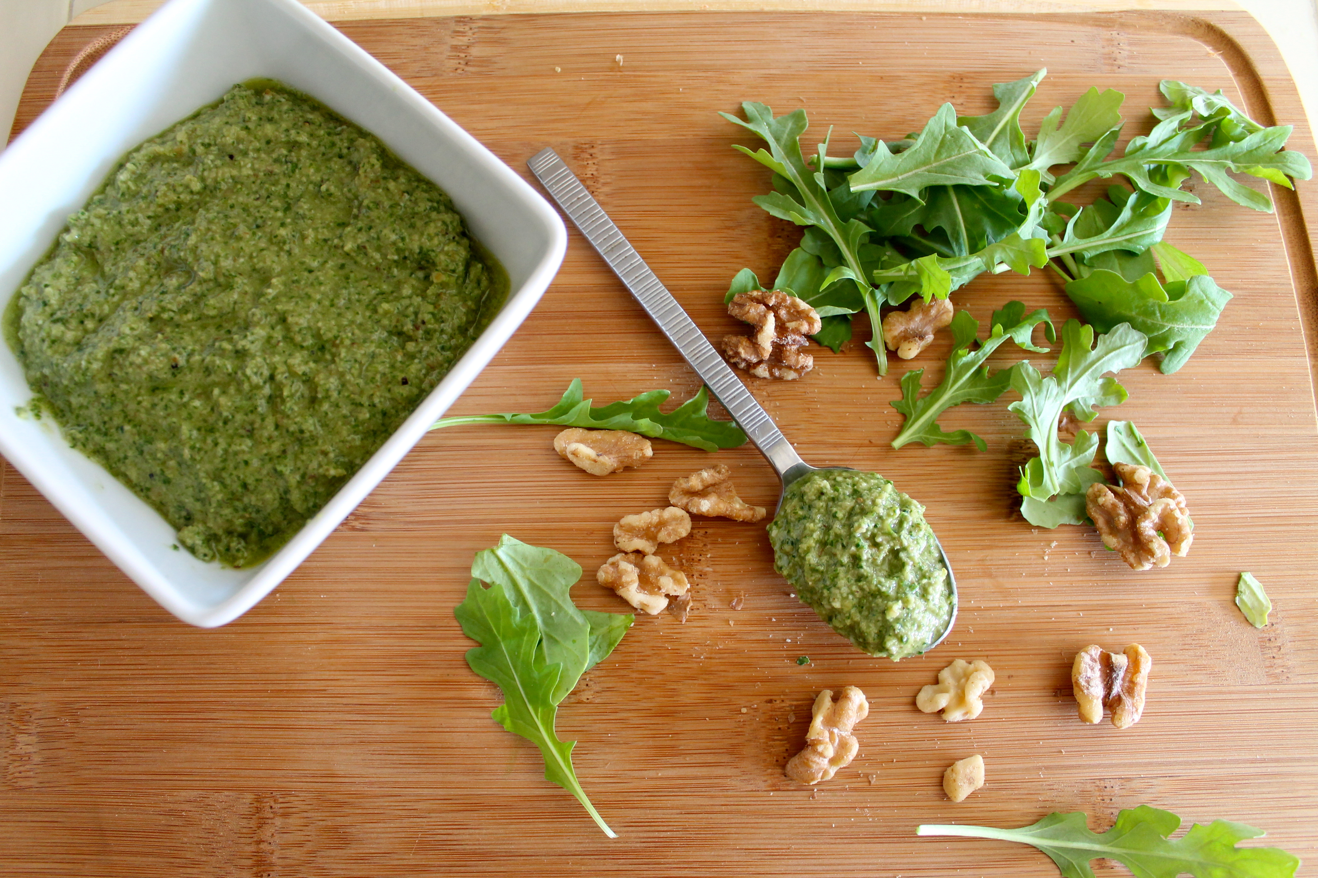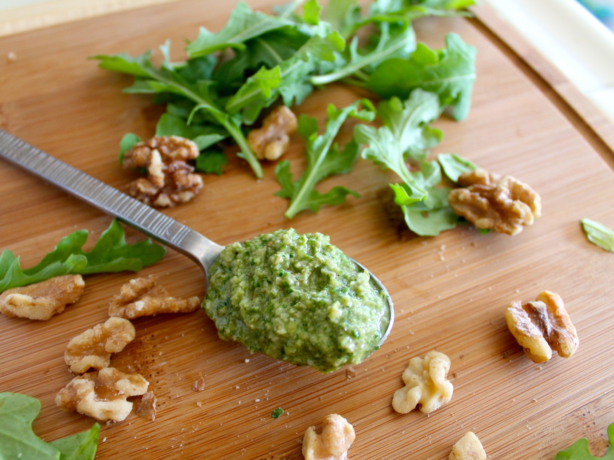 Pesto is something that each chef, cook, mom, kitchen-dominator makes their own. Tweak as necessary, and don’t be scared to stray away from the measurements. Use them as a guideline and make this arugula-walnut pesto yours.
