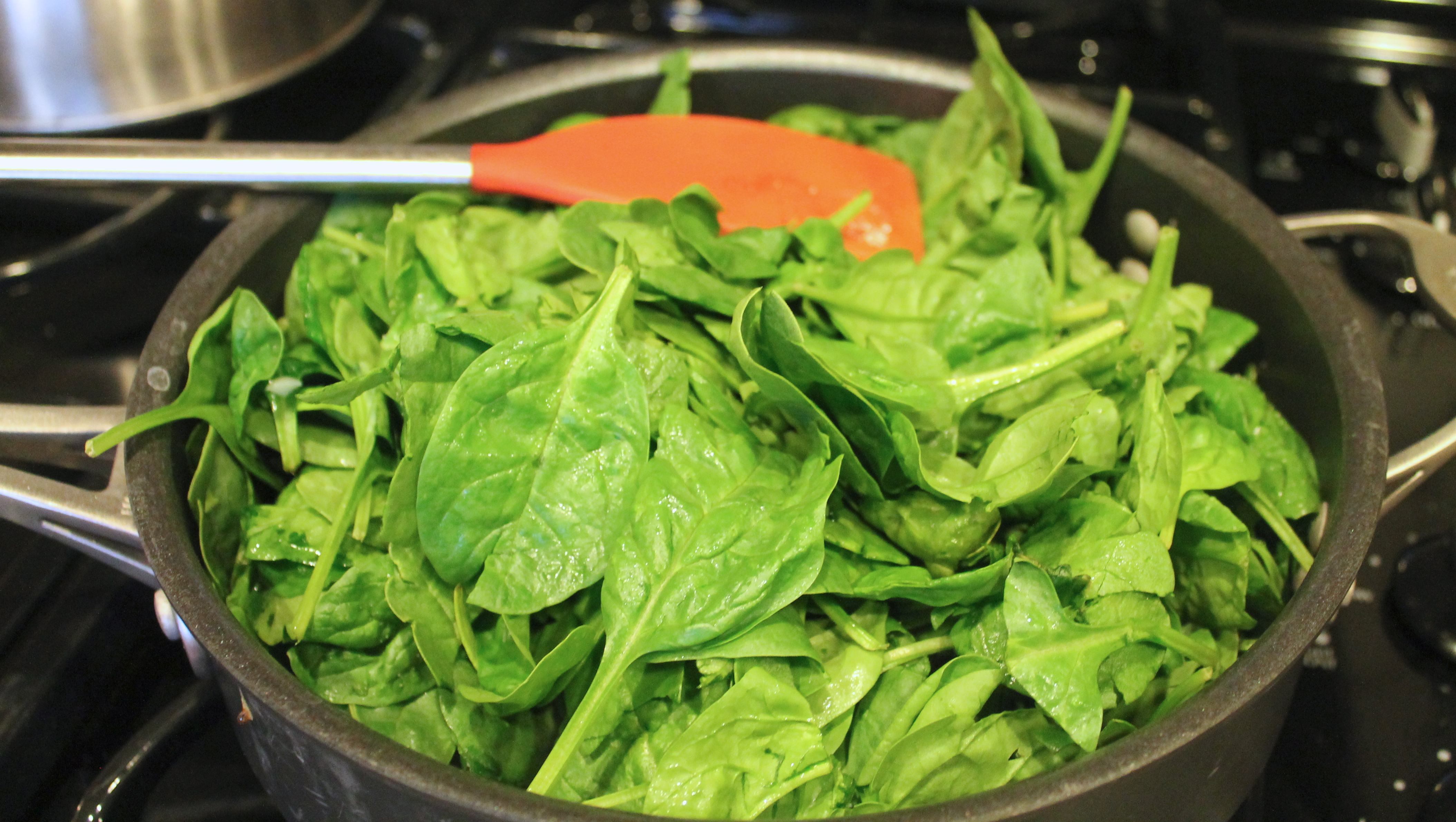 - In a large skillet, heat a heavy-bottomed pan over medium hear with the olive oil. Add the chopped garlic and cook for three minutes. Add the spinach and toss, cooking until wilted — about 6 minutes. Drain the spinach once it’s wilted, squeezing out any excess moisture.