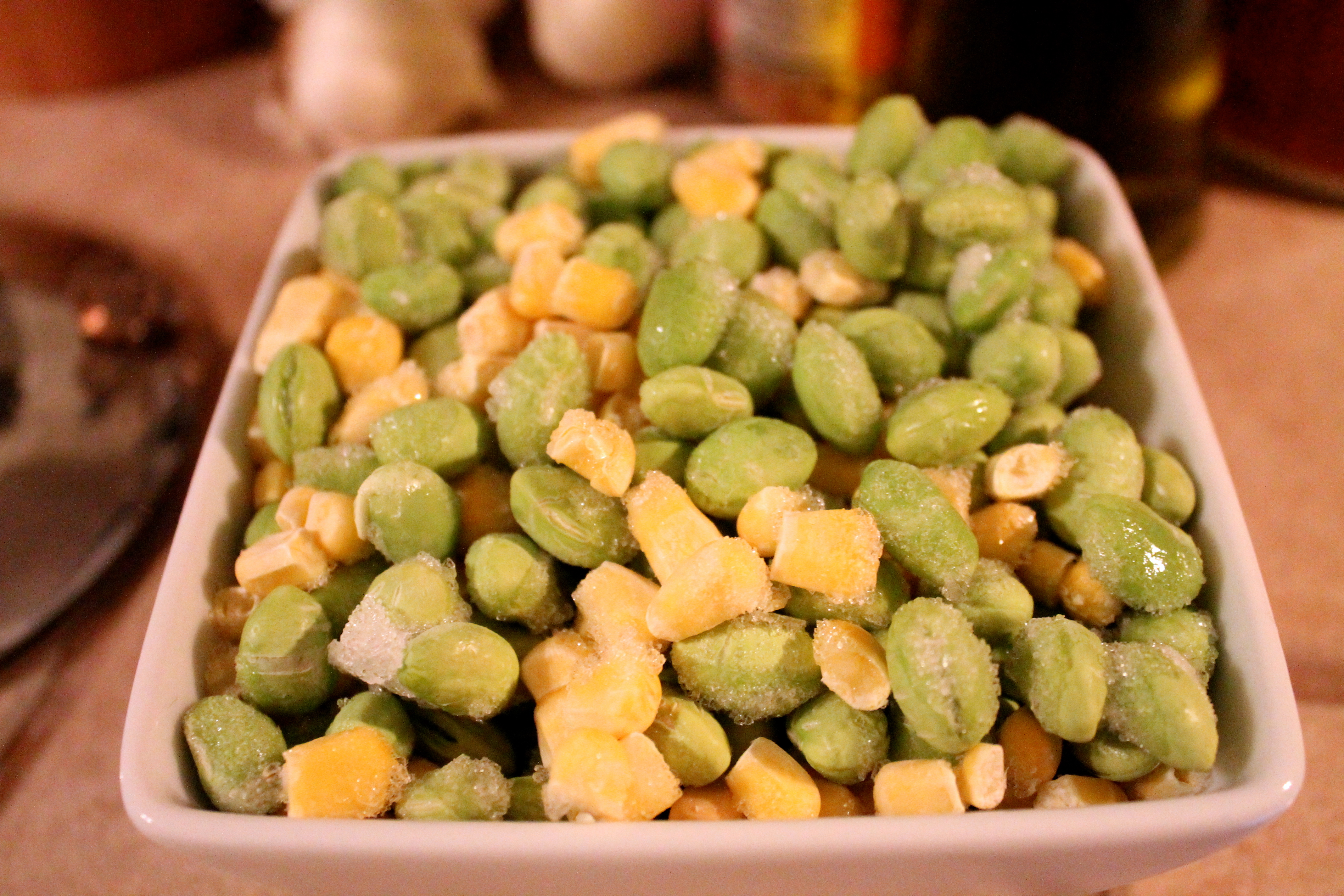 - Add the frozen corn and edamame to the pan and give a quick stir. Add your spices, stir again.