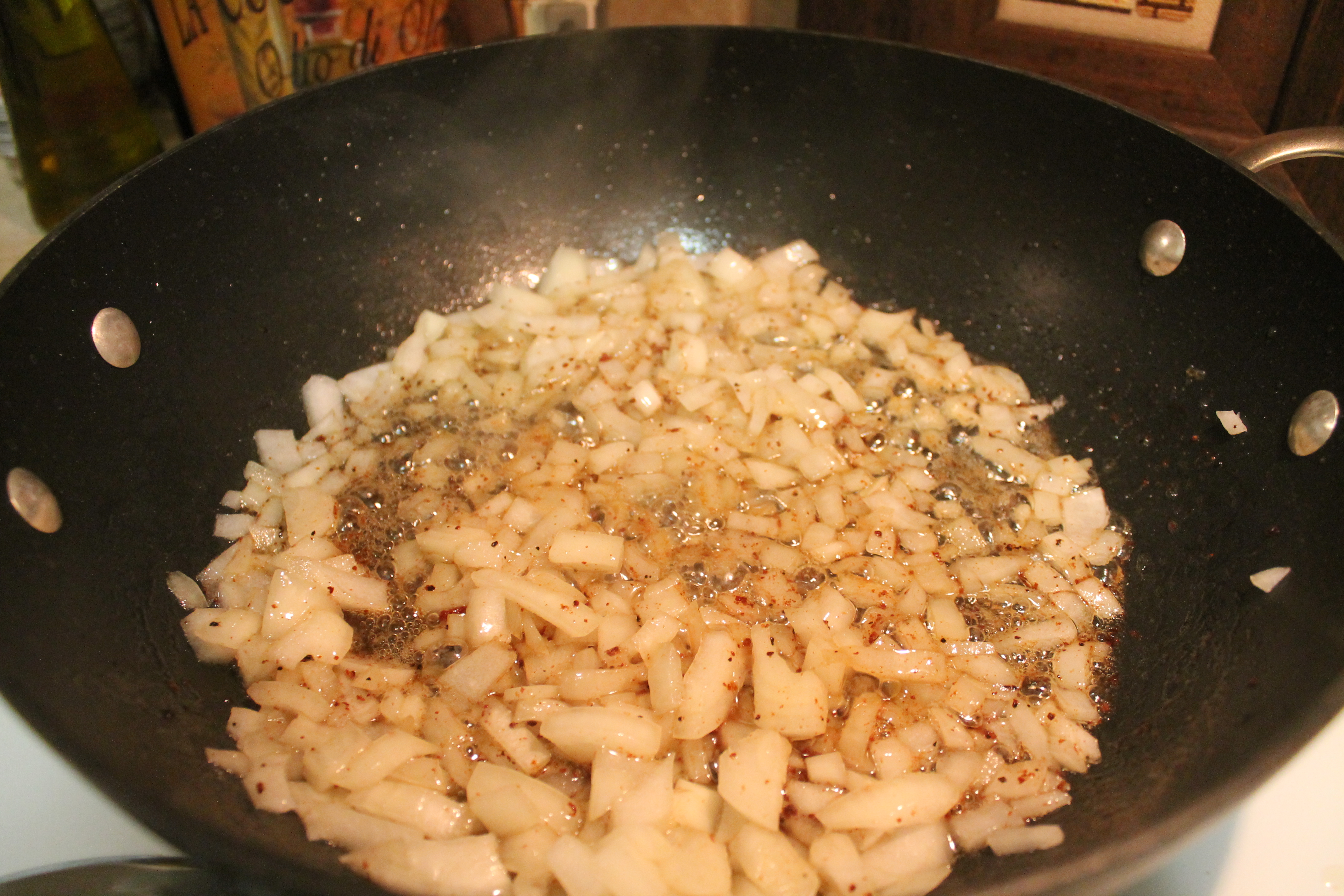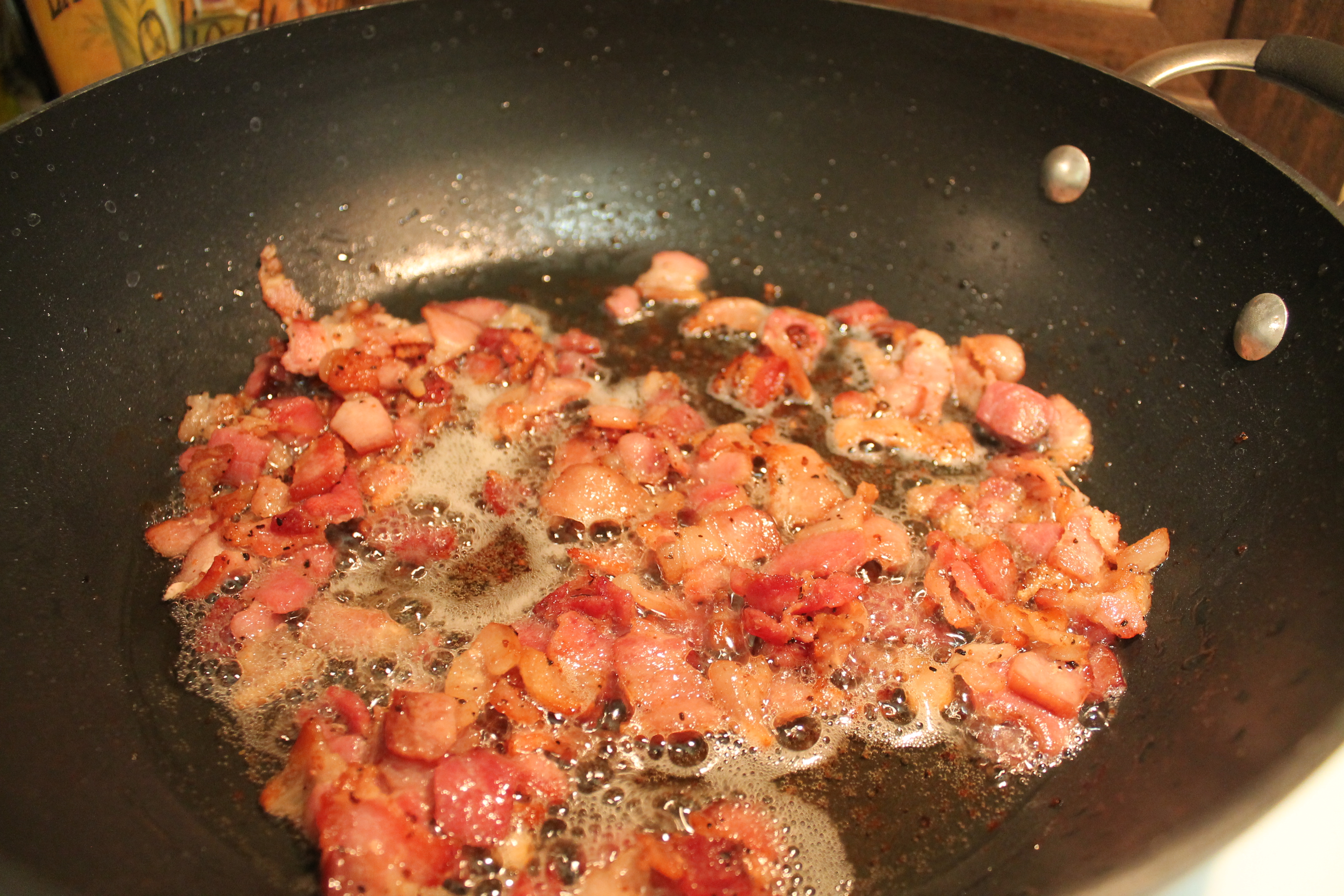 - Meanwhile, cook the sliced bacon in a large, non-stick skillet over medium heat until crisp. Remove the bacon and let drain on a plate lined with paper towels. Leave the grease in the pan. (If this is too much for your heart to handle, dump the grease and add in a drizzle of EVOO.)