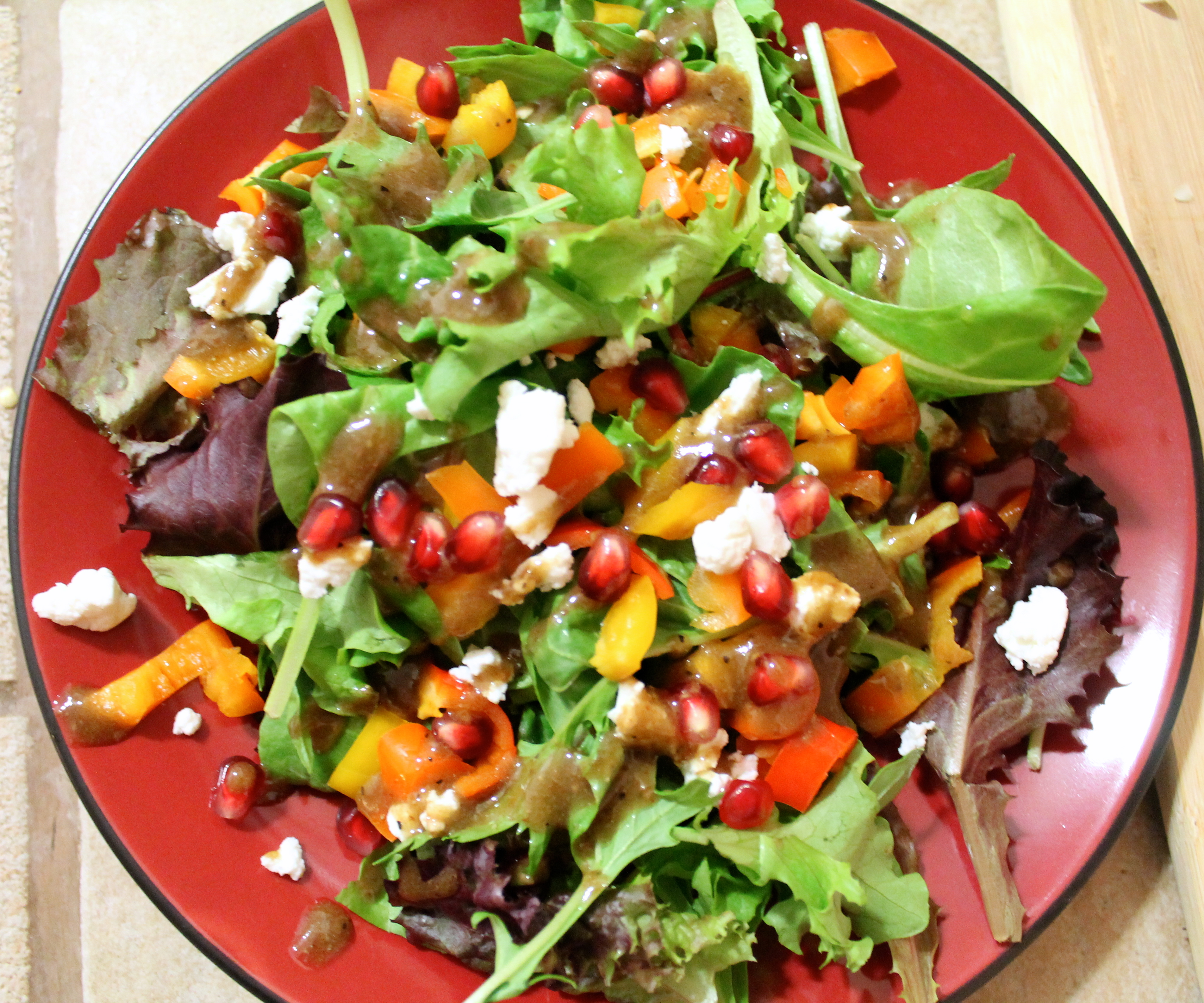 - Evenly distribute the spring mix on four plates and top with the goat cheese, peppers and pomegranate seeds