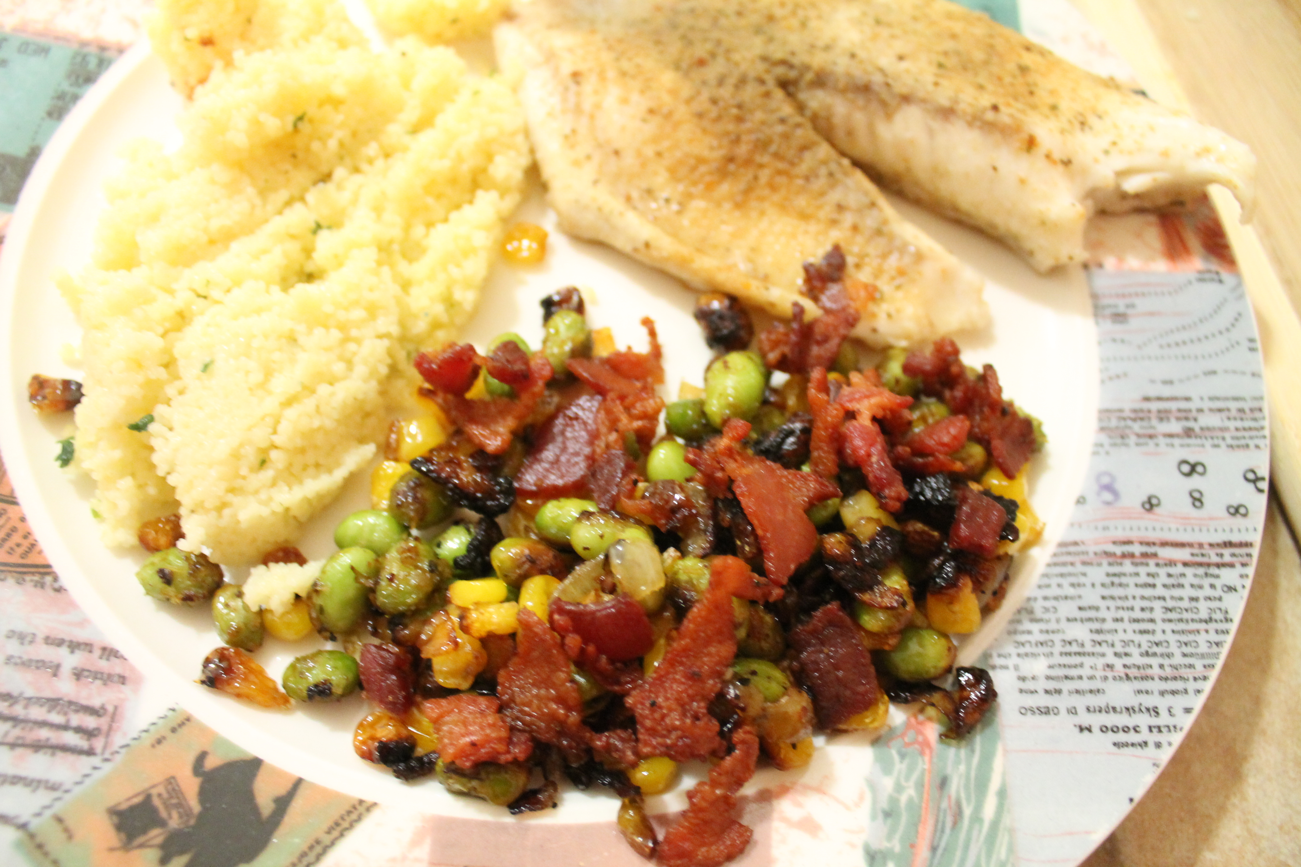 I came up with a succotash that’s super simple: onions, corn, bacon and, for added protein (ahem, and color), edamame. The result was a beautiful thing. It’s my favorite “side dish” with white fish and super easy to throw together. Plus, you can keep most of the ingredients on-hand.