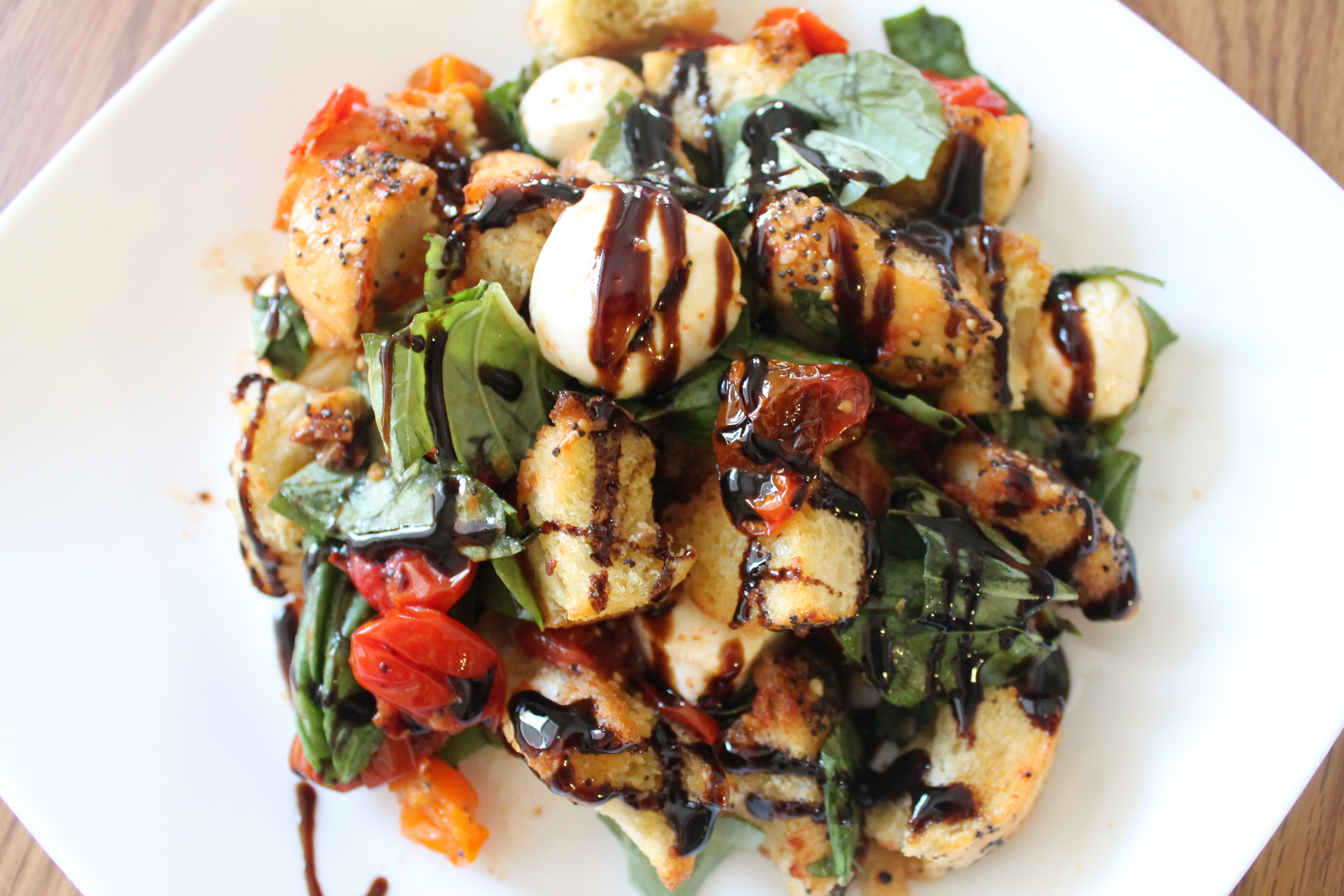 Panzanella is a perfect example of how simple, clean flavors can be absolutely spectacular when mixed together. It’s typically a summer dish thanks to the star of the show, tomatoes, but here in San Diego, summer never really ends. So Panzanella is year-round, which makes for lots of happy bellies.