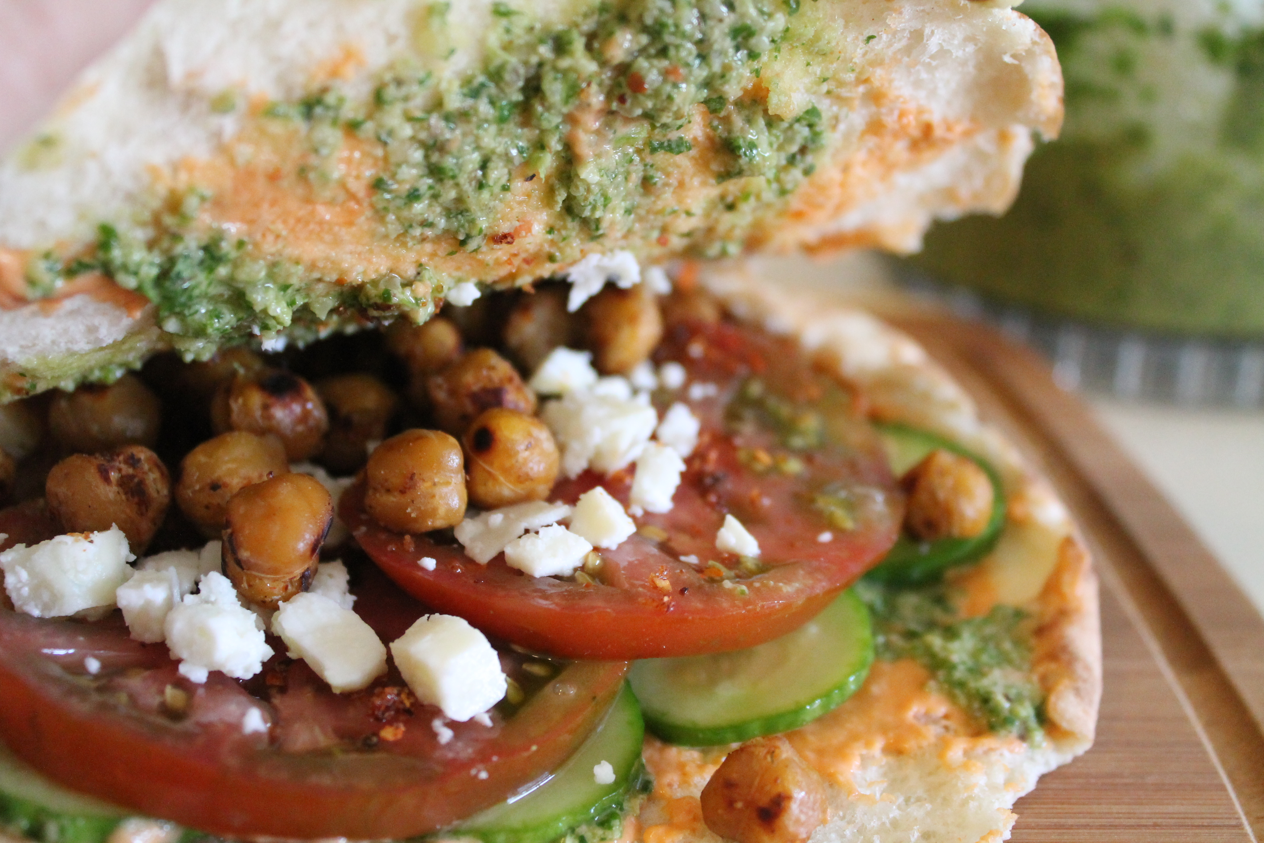 Tomato-Cucumber Pita with Hummus, Pesto and Crispy Chickpeas